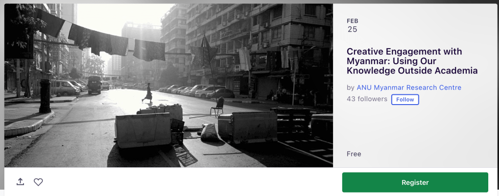 “Creative Engagement with Myanmar: Using our Knowledge Outside Academia,” ANU’s MRC 2022 Dialogue Series. Register here.