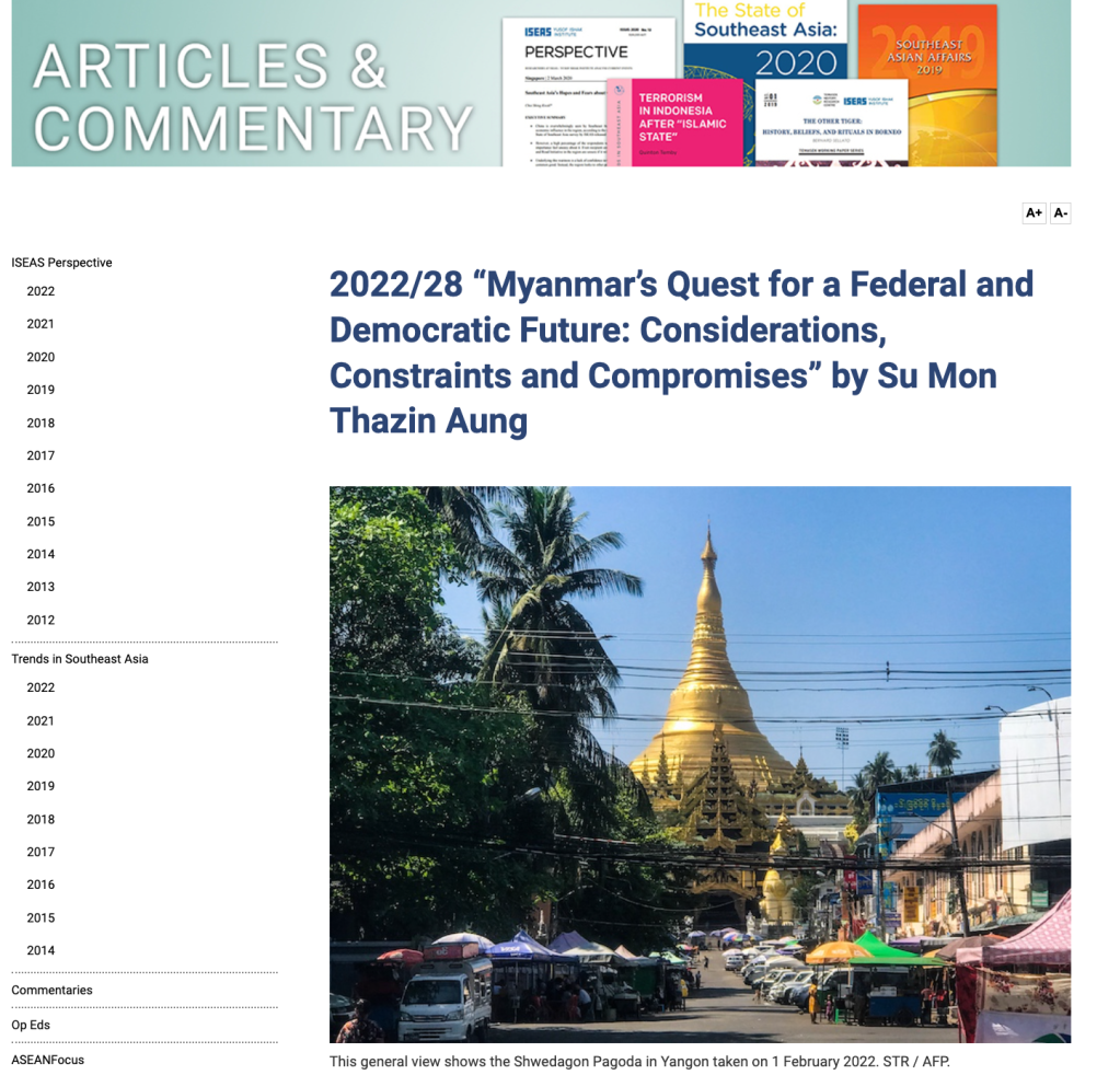 But first, this week in BSG Pubs we feature Su Mon Thazin Aung’s analysis of what’s going on between the NUCC and the NUG/CRPH; Maber et al on the precarious politics of teacher ed in Myanmar; and Liyun Wendy Choo’s take on Bama privilege. See here for full citations: https://burmastudiesgroup.wordpress.com/recent-publications-2/.