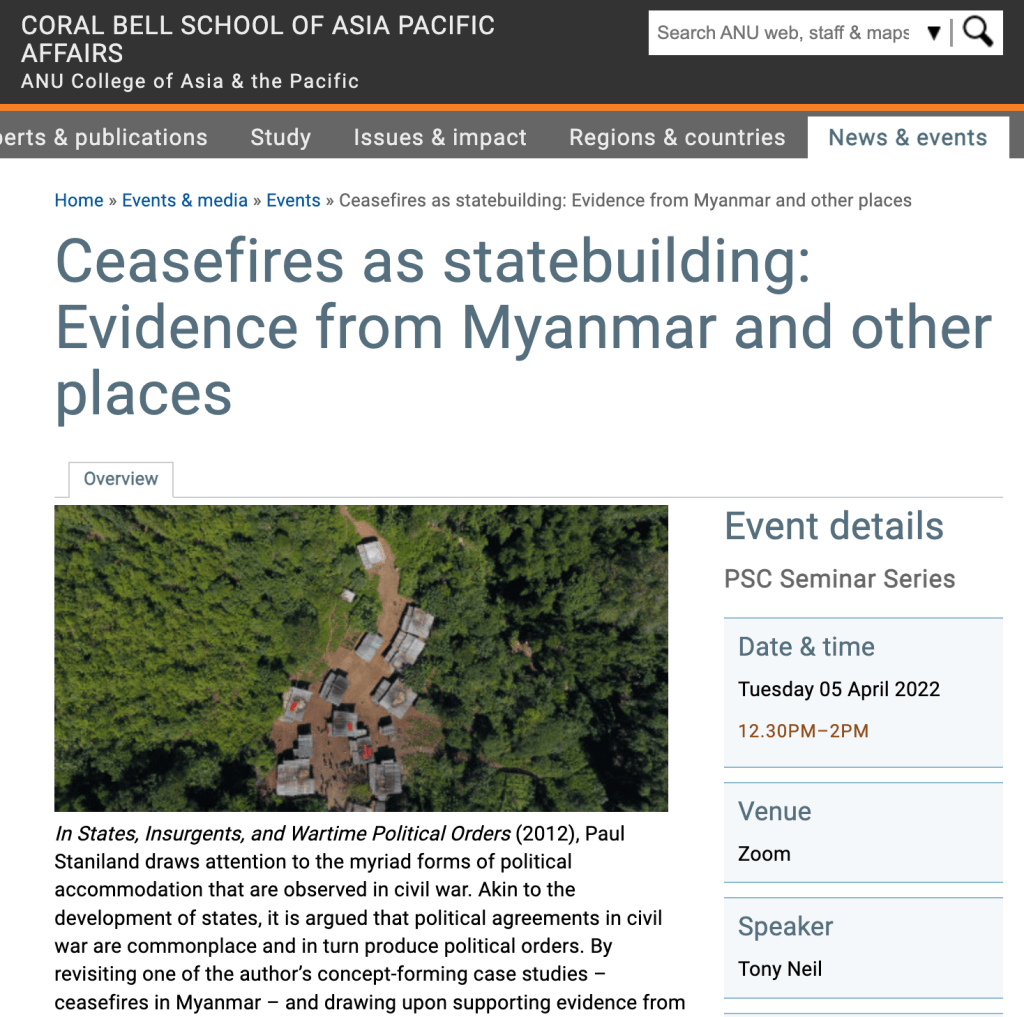 Event: Tony Neil, Ceasefires as statebuilding – Evidence from Myanmar and other places Tuesday 05 April 2022; 12.30PM–2PM; more information here, and see here for our full calendar. Share this: Click to share on X (Opens in new window) X Click to share on Facebook (Opens in new window) Facebook Like Loading... Related