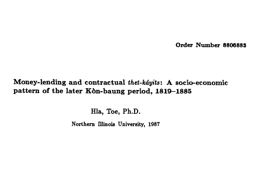 “A debt of money can be liquidated but a debt of gratitude is never completely settled” – so goes the epigraph to Toe Hla’s 1987 PhD dissertation on money lending during the Kon-baung period, a fascinating study of social relations of the time rendered through examination of exchange. We also feature more recent studies of debt that may have flown under the radar, with Carstens and Watanabe, respectively, exploring how kyay-zu (rendered as ‘debt’) likewise sometimes may never be discharged, while Campbell shows how debt works to link squatters – seemingly ‘outside’ of capitalism – to markets as de facto wage workers.