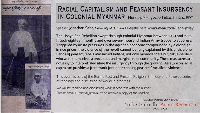 Event: Jonathan Saha on Saya San and Racial Capitalism hosted by York | 9 May – 16:00 – 17:30 (EDT) Here is the zoom link. Share this: Click to share on X (Opens in new window) X Click to share on Facebook (Opens in new window) Facebook Like Loading... Related