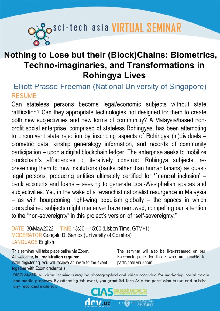 Event: Elliott Prasse-Freeman on Rohingya and blockchained futures 30 May 2022 | 1:30 to 3:00 (Lisbon; GMT + 1) Zoom link here. see here for the entire calendar of upcoming events. Share this: Click to share on X (Opens in new window) X Click to share on Facebook (Opens in new window) Facebook Like Loading... Related