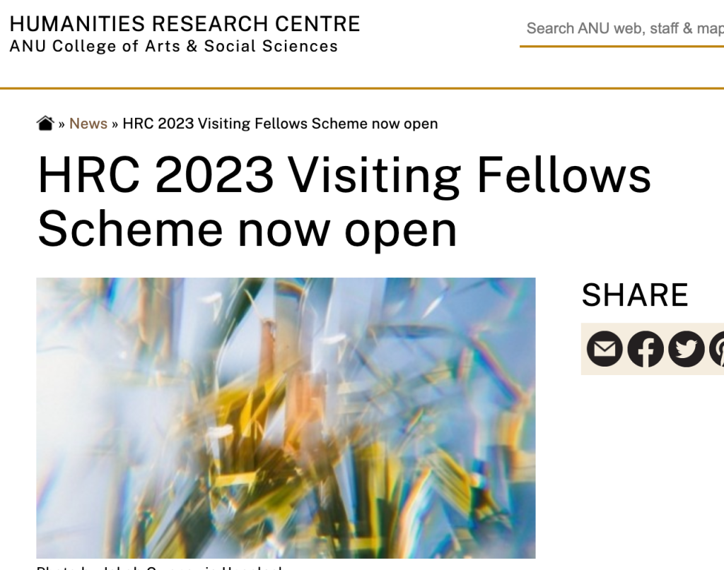 Applications are now open for the 2023 ANU Humanities Research Centre Visiting Fellowship program. About the fellowship program: