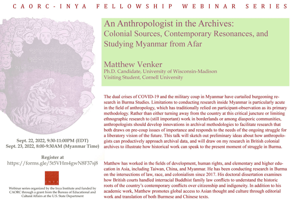 Event: Matthew Venker, “An Anthropologist in the Archives” 23 Sept 2022, 8:00am (Myanmar Time). sign up here: Share this: Click to share on X (Opens in new window) X Click to share on Facebook (Opens in new window) Facebook Like Loading... Related