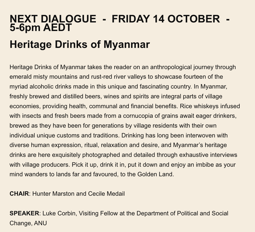 Event: Luke Corbin on Drinks in Burma Time: 14 Oct – 5-6pm (Australia time) Register here. Share this: Click to share on X (Opens in new window) X Click to share on Facebook (Opens in new window) Facebook Like Loading... Related
