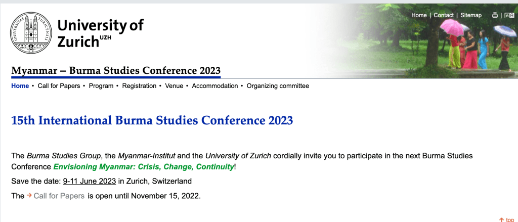 Call for Papers: Burma Studies Conference 2023 in Zurich Due: 15 November 2022 See here for the CFP details. Share this: Click to share on X (Opens in new window) X Click to share on Facebook (Opens in new window) Facebook Like Loading... Related