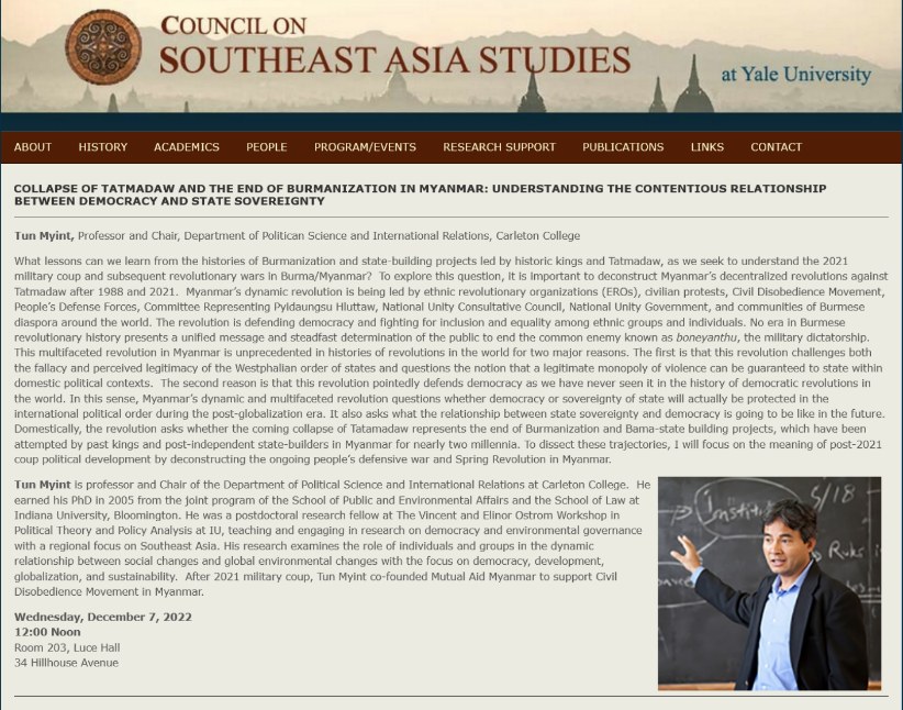 Event: Tun Myint on the collapse of the Sit-Tat and Burmanization Yale’s CSEAS is hosting Carleton College scholar Tun Myint on 7 Dec 2022, 12pm. see here. Share this: Click to share on X (Opens in new window) X Click to share on Facebook (Opens in new window) Facebook Like Loading... Related