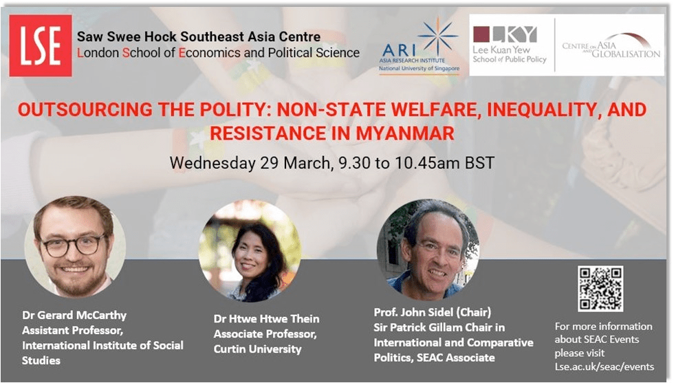 Event: McCarthy on Outsourcing the polity, with Htwe Htwe Thein Date29 Mar 2023Time16:30 – 17:45 (SGT)VenueOnline via Zoom sign up here Share this: Click to share on X (Opens in new window) X Click to share on Facebook (Opens in new window) Facebook Like Loading... Related