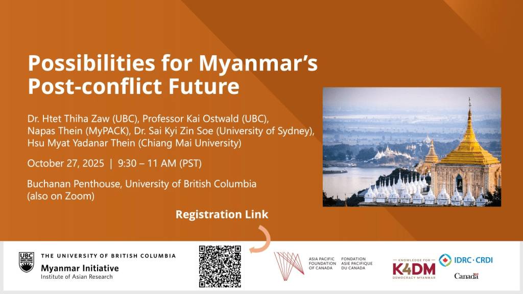 In this panel discussion, co-hosted by the University of British Columbia (UBC) and the Asia Pacific Foundation of Canada, researchers from the UBC Myanmar Initiative and the Knowledge for Democracy in Myanmar Initiative will share their perspectives on the recent conflict dynamics and possibilities for Myanmar’s post-conflict future.