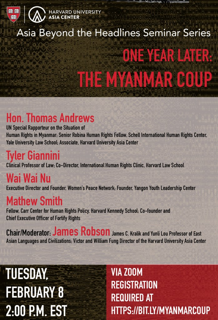 Now that the rush of coup anniversary events have passed, you might be tempted to relax. But don’t you dare get off zoom, tho, b/c there are a number of other good ones coming up, including Burmese poetry at Harvard, Exploring Violence and Resistance in Denmark, and the Marxist Leftist Review on “Myanmar’s unfinished revolution” in Sydney. There is also an ongoing film festival that goes until the 14th.